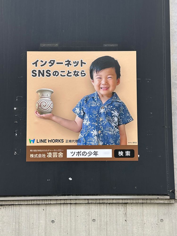 当社のタイアップモデルとして、2024年より当社の屋外看板のイメージキャラクターをしていただいている少年です。最初に看板を設置した那覇市壺屋地区は、那覇市の景観地区に指定されており、那覇市の壺屋やちむん通りが観光地としても有名です。